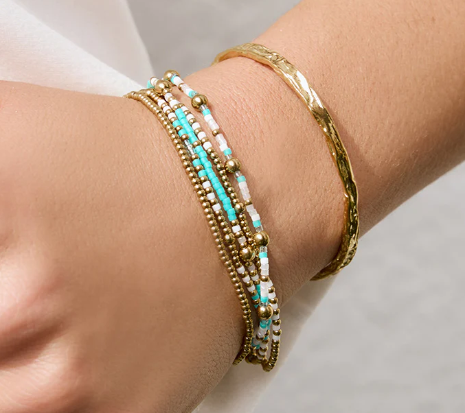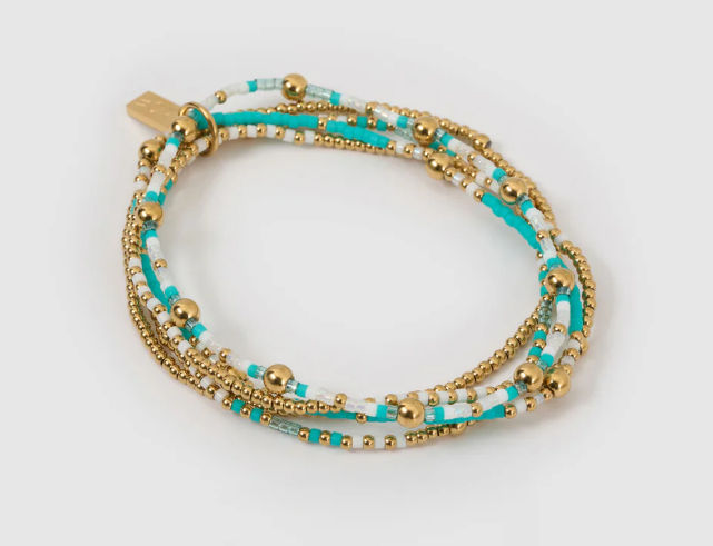 Stacking made simple with the Nellie Bracelet, a beaded beauty designed to add a playful pop of colour to your look. Featuring a mix of ocean, white, and golden beads, it's rich in texture and effortlessly cool.