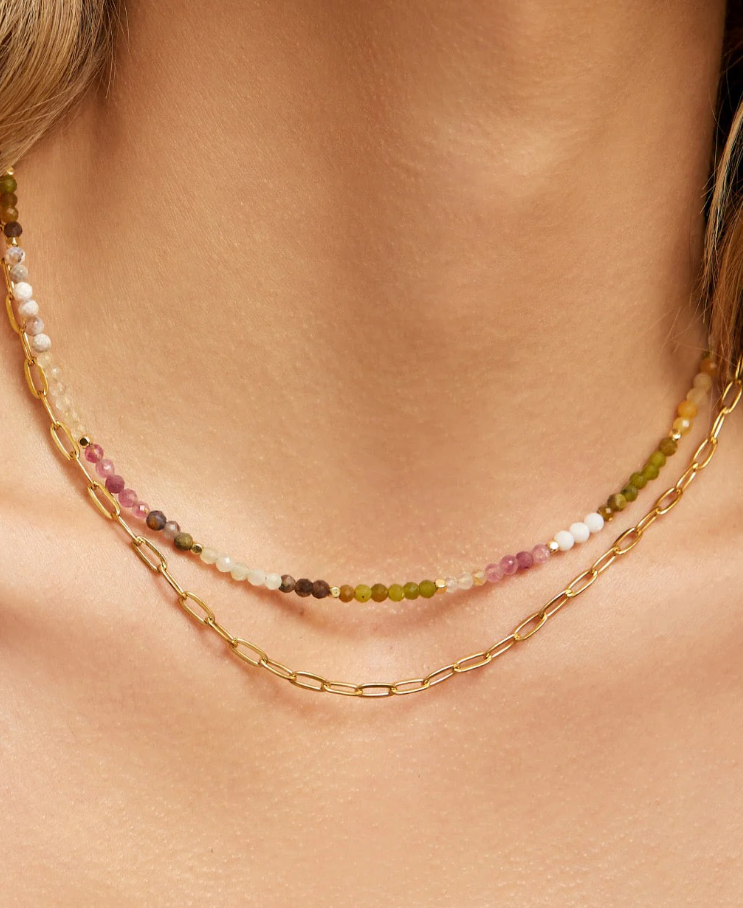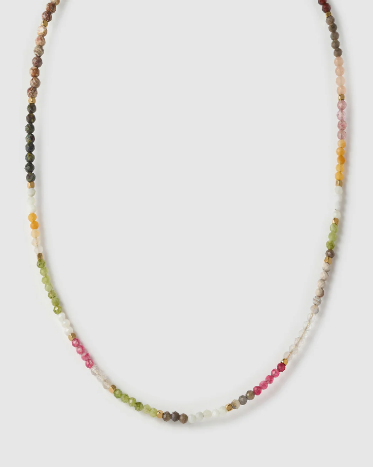 Gemstones galore, meet the Saffron Necklace. Adorned with a radiant mix of natural gemstones, this colourful piece brings a touch of healing energy and vibrant beauty to your everyday style.