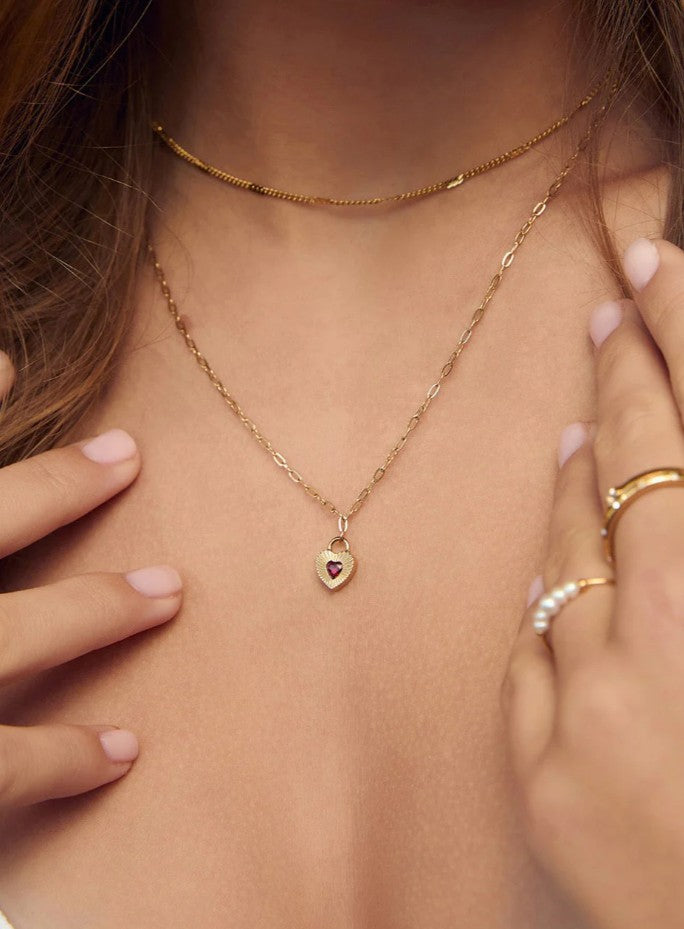 Add a touch of romance to your everyday stack with the Ruby Heart Necklace, a cute piece sure to be adored by all! Featuring a heart charm with a shimmering stone, Ruby will have you turning heads and capturing hearts wherever you go.