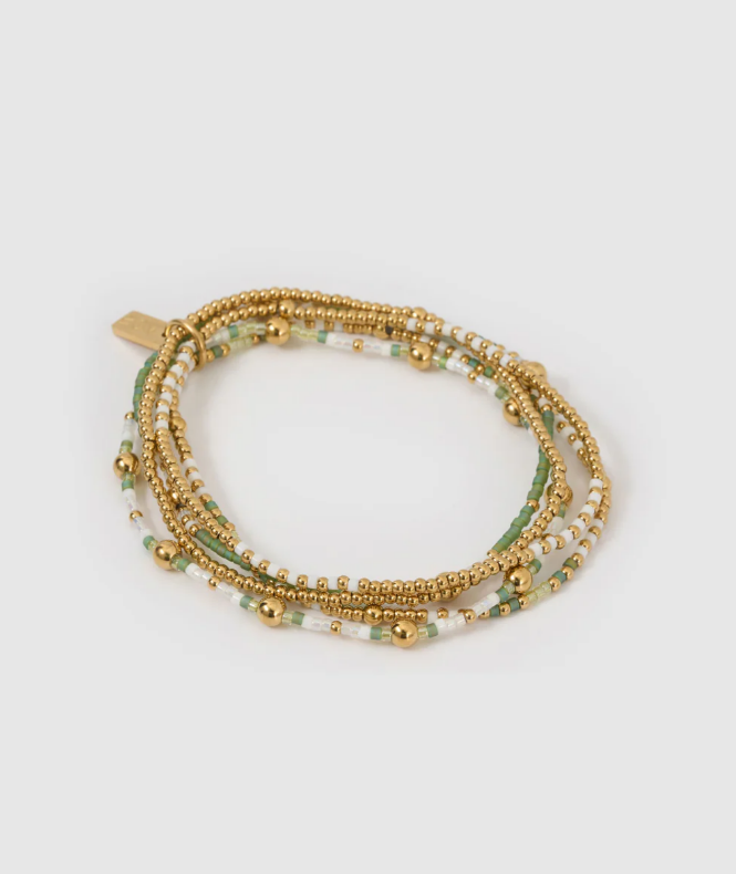 Stacking made simple with the Nellie Bracelet, a beaded beauty designed to add a playful pop of colour to your look. Featuring a mix of Forrest, white, and golden beads, it's rich in texture and effortlessly cool.