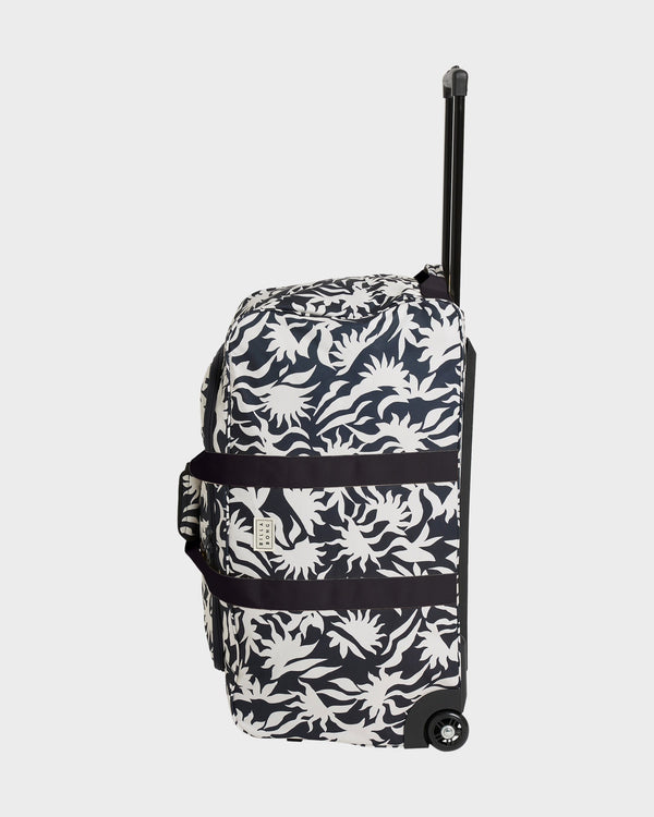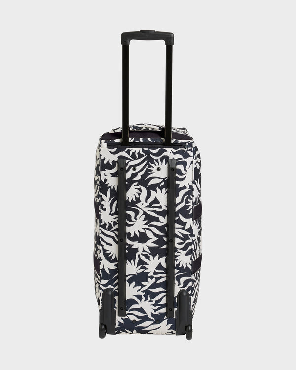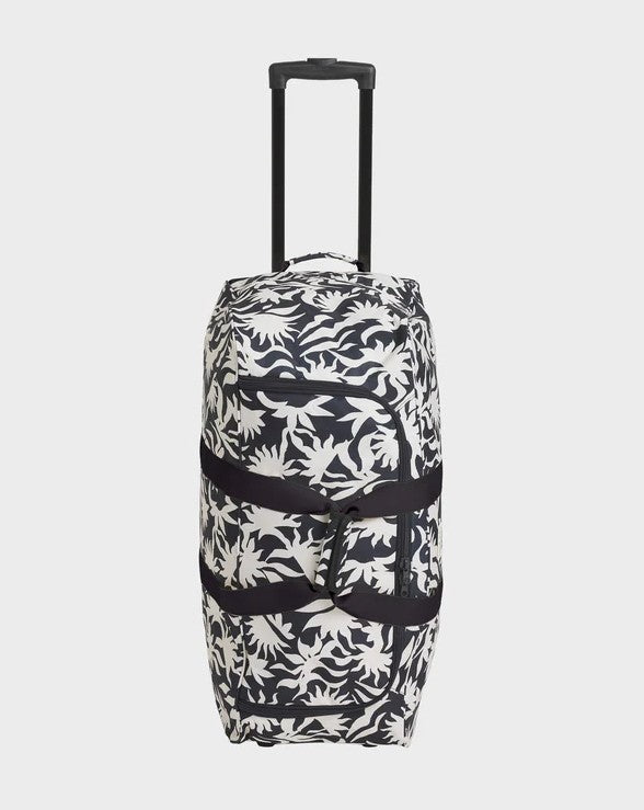 Travel toteTrolley system with telescopic handleZip pulls75L volume27 x 14 x 12.5 inchesEmbroidered front patch