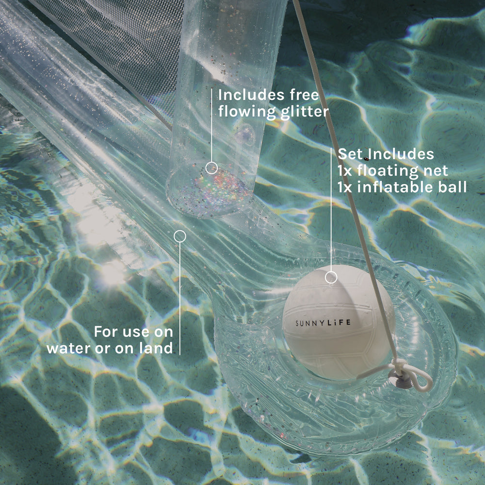Enjoy endless summer fun with the SUNNYLiFE Inflatable Volley Ball Set. This set features a floating net and an inflatable ball filled with sparkling glitter, secured by a special valve to keep glitter contained. The stable water-fillable base ensures steady play on water or land. Made from durable, non-toxic, phthalate-free PVC, it includes a repair patch for added longevity. Designed for both safety and performance, this set is perfect for friendly matches wherever you go.