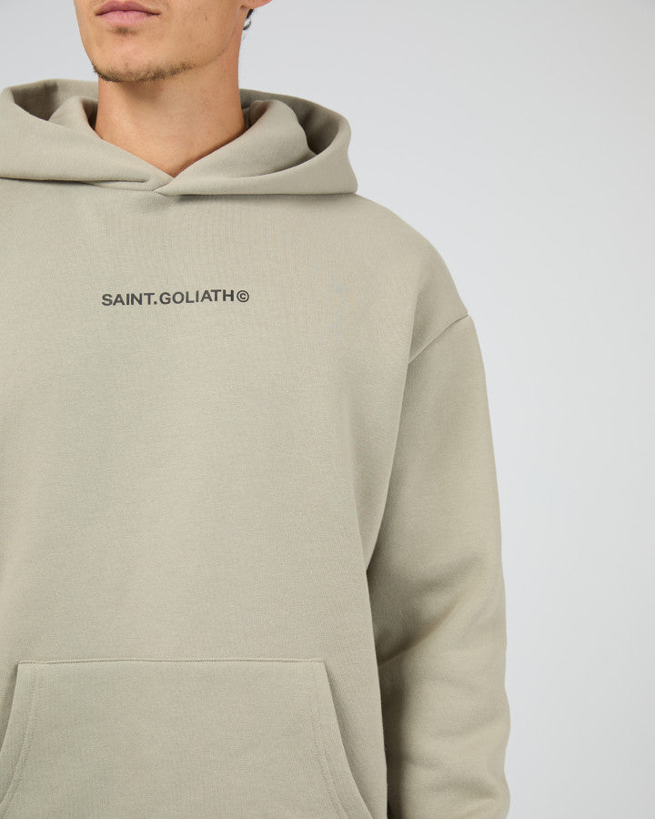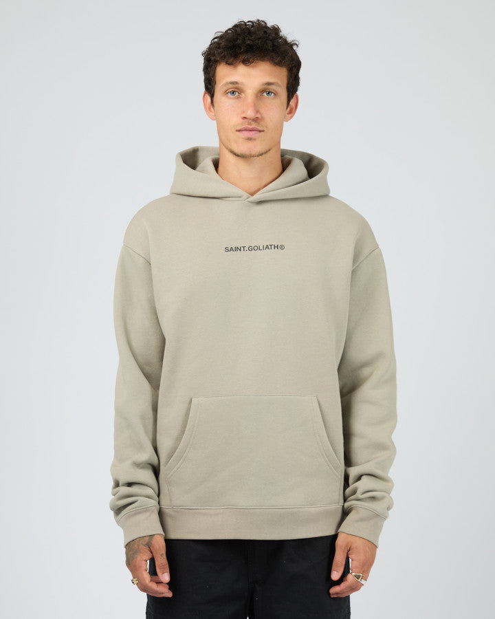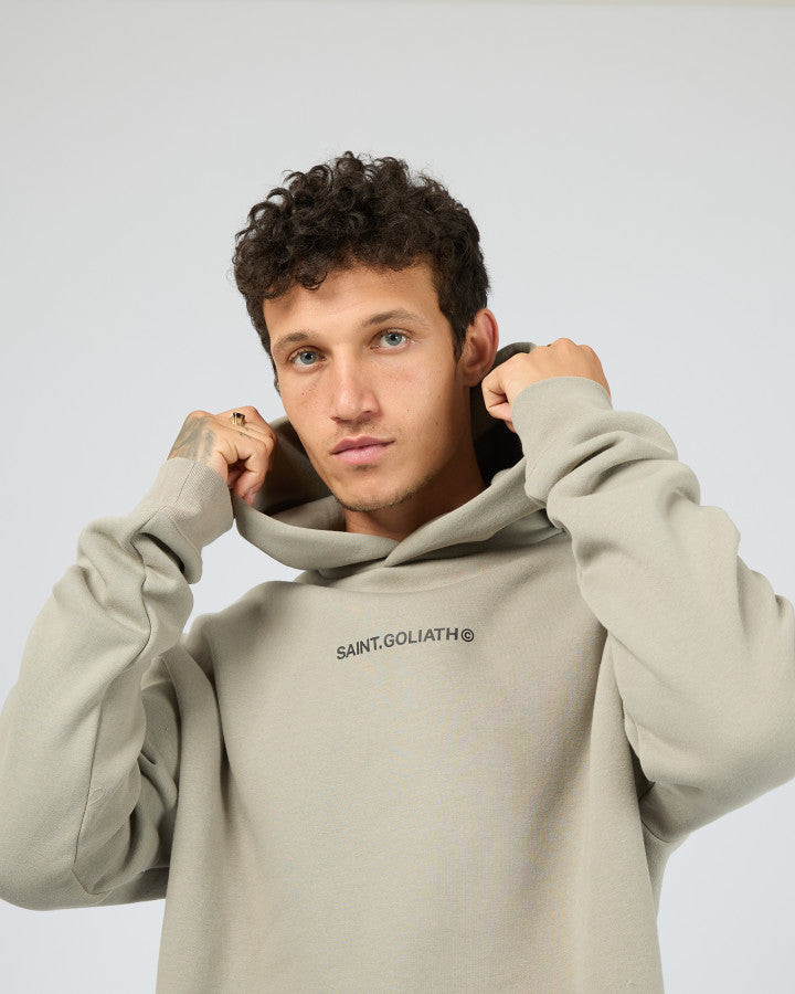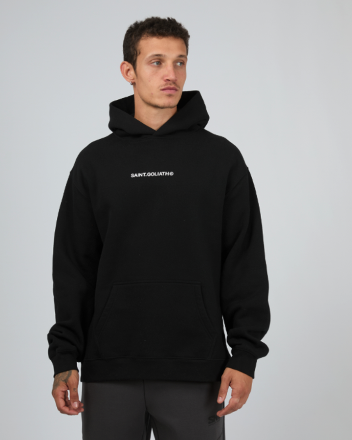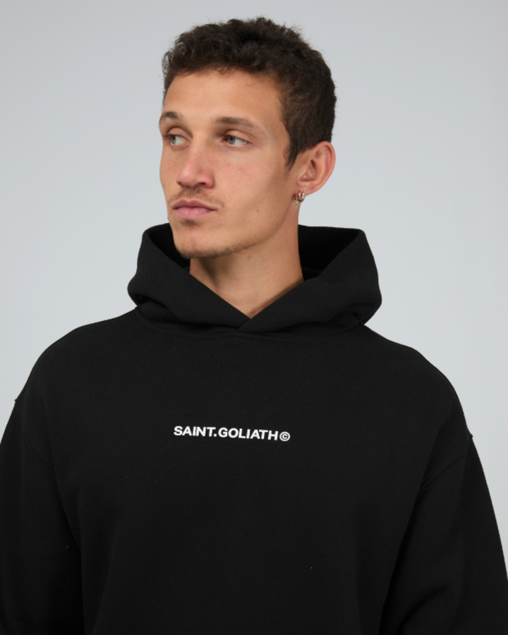 The Id Hoodie features a minimalist design with a subtle Saint Goliath graphic on the chest. Its relaxed fit and hooded neckline provide comfortable coverage and a modern silhouette, making it a versatile piece for layering or standalone wear.